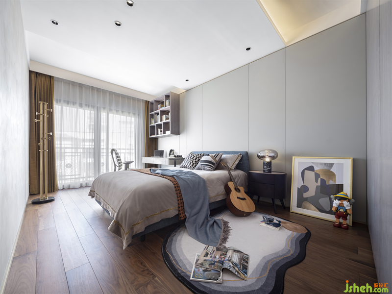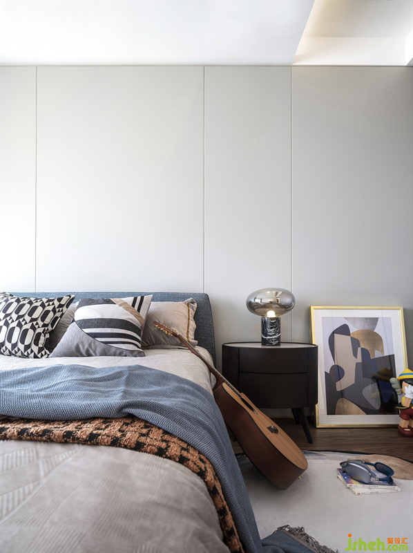 純凈的藍色、熱烈的橙色,演繹出正值青春年少的純凈與活力,樂器、耳機及潮玩擺件碰撞出一個有趣的藝術(shù)世界,大兒子房的設(shè)計自由且充滿活力,就像我們的青春沒有過多的約束,未來充滿無限的可能。