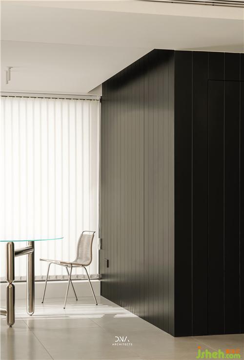 立面材質(zhì)以黑色、灰色、木紋三個(gè)主要塊面來快速劃分不同的功能區(qū),并設(shè)計(jì)了大量的隱蔽收納,來維持外部整潔性。