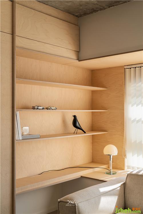 ▼開放書柜以窗臺(tái)的延伸形態(tài)呈現(xiàn),更加自然地處理兩個(gè)立面的轉(zhuǎn)換關(guān)系。