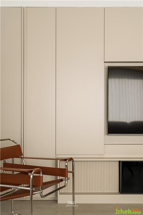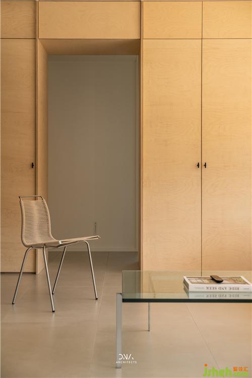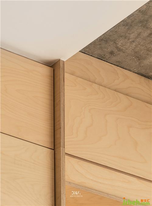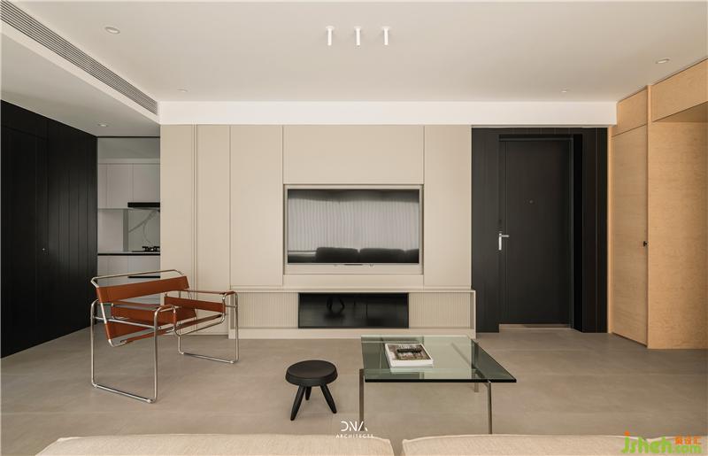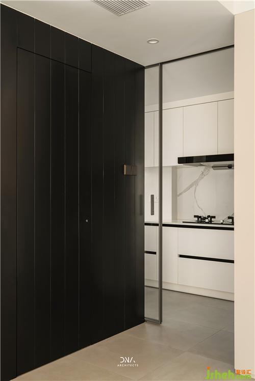 ▼通過黑、灰色兩個(gè)塊面之間形成通往廚房的入口,頂面暗裝移門軌道來保持簡潔的設(shè)計(jì)語言。