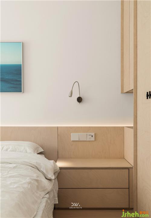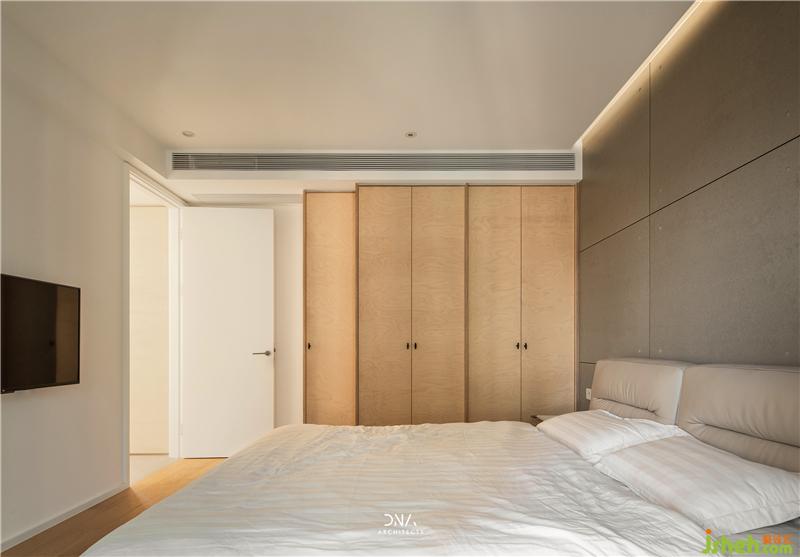 臥室整體延續(xù)了樺木和水泥色的材質(zhì)運用,頂面暖色燈帶營造的氛圍消除了水泥的冰冷感。