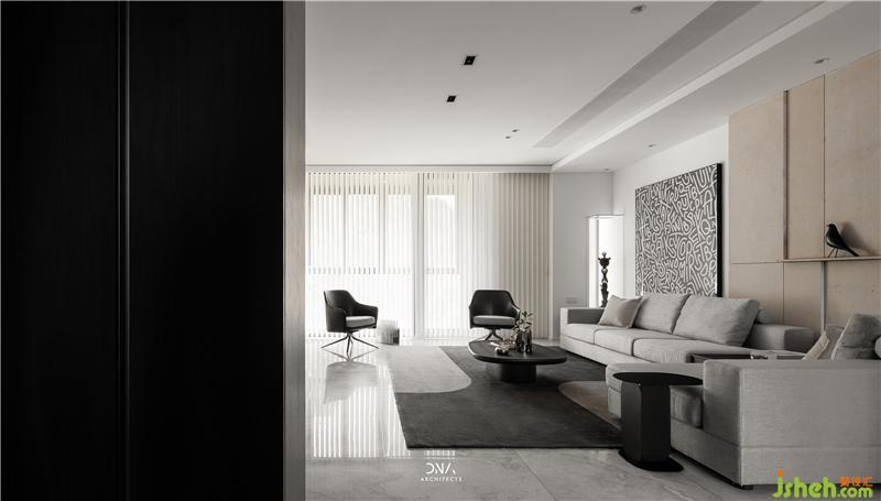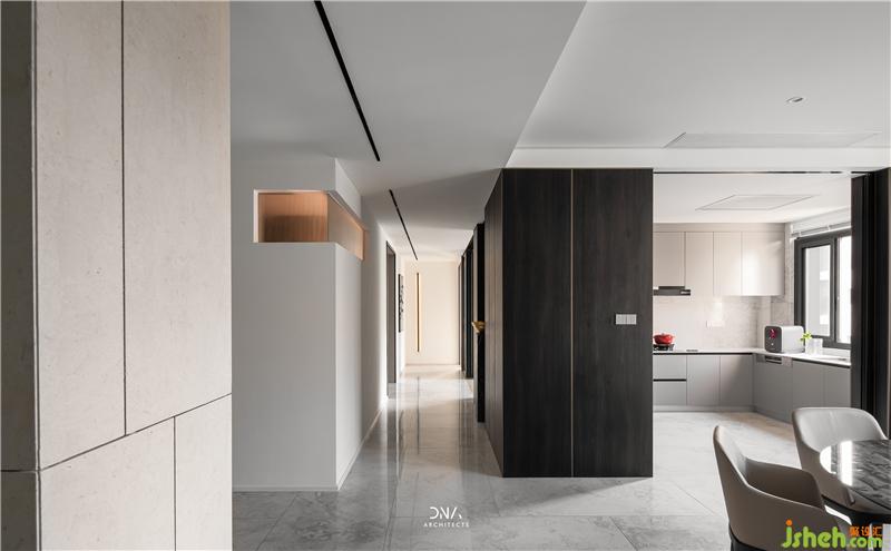 將北側書房的墻體打開引入光線,消除長過道帶來的幽閉感,杭州裝修設計同時墻面深淺對比的材質清晰地劃分出動靜分區(qū)。
