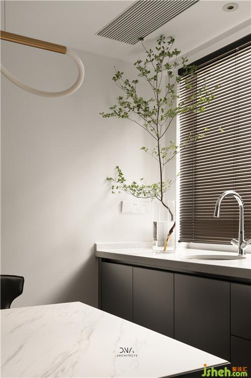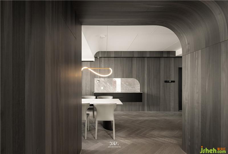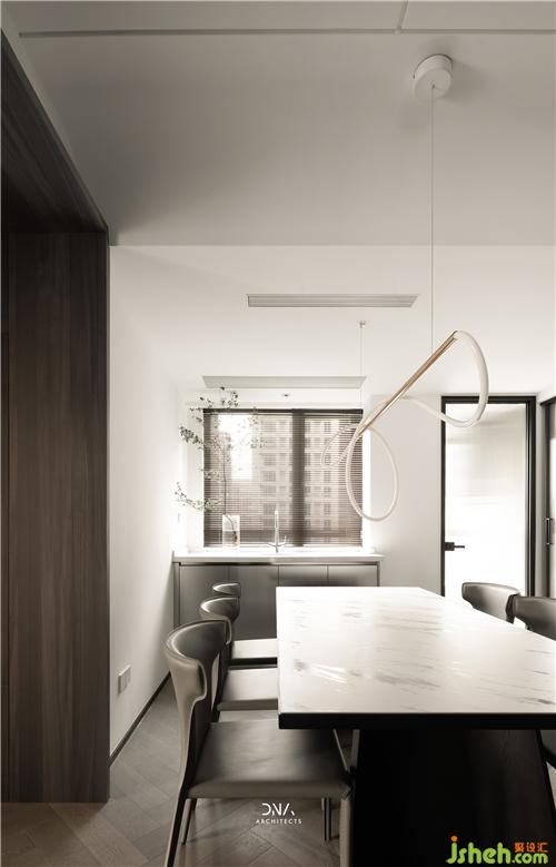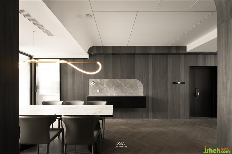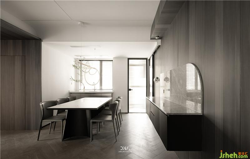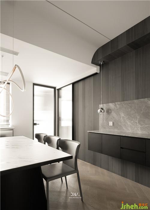 餐廳在水吧臺餐邊柜的半包裹的圍合中,借由長虹玻璃讓餐廳和廚房和諧銜接。