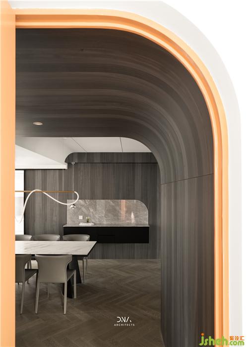 入門以定制木紋的木飾面連貫至餐廳主墻,凝練出簡樸溫潤的氣息杭州裝修設(shè)計。懸挑的餐邊柜,呼應(yīng)的圓弧造型,作為玄關(guān)與餐廳空間的中介量體。
