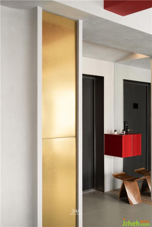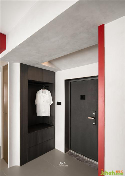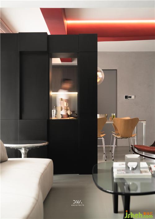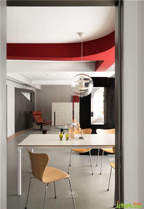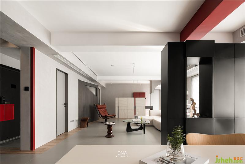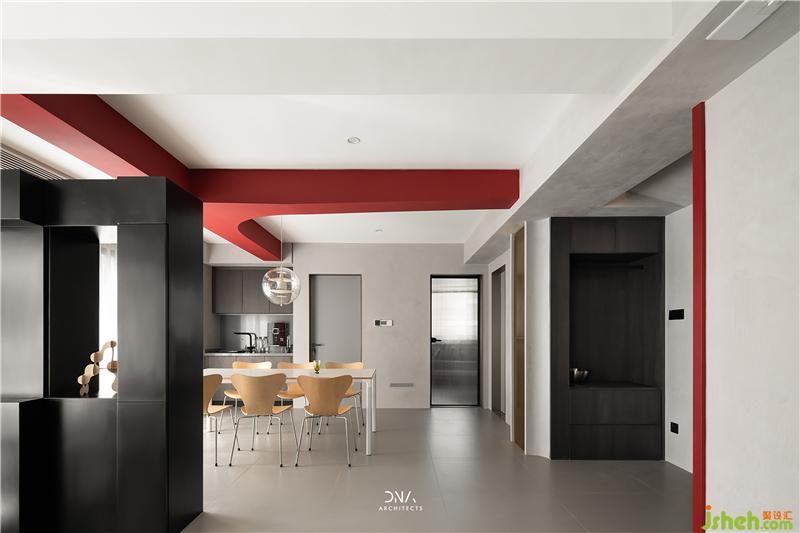 不規(guī)則的幾何線條互相結(jié)合,無裝飾的立面造型,紅與黑的對撞色構(gòu)成了一個自由開放的幾何平面,為空間奠定了風(fēng)格基礎(chǔ),為其注入了熱情和溫度。