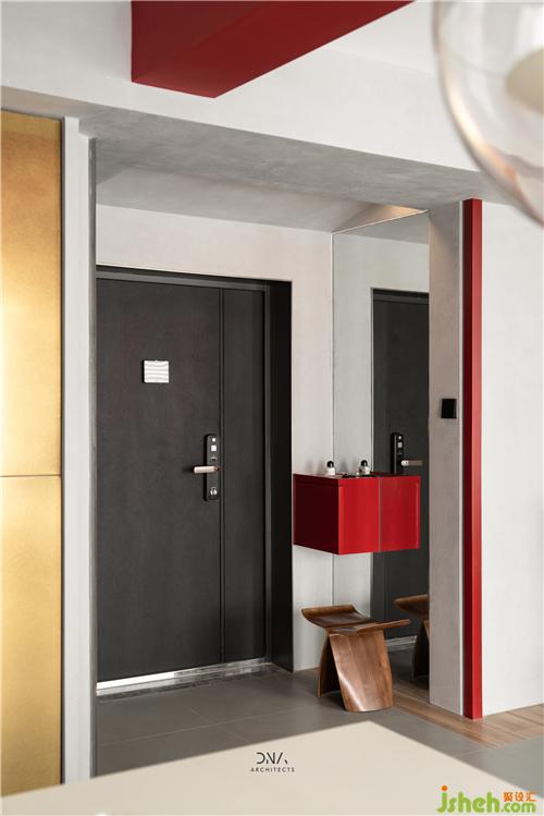 Irregular geometric lines are combined with each other, the undecorated facade shape, and the contrasting colors of red and black form a free and open geometric plane, which lays the style foundation for the space and injects passion and temperature into it.