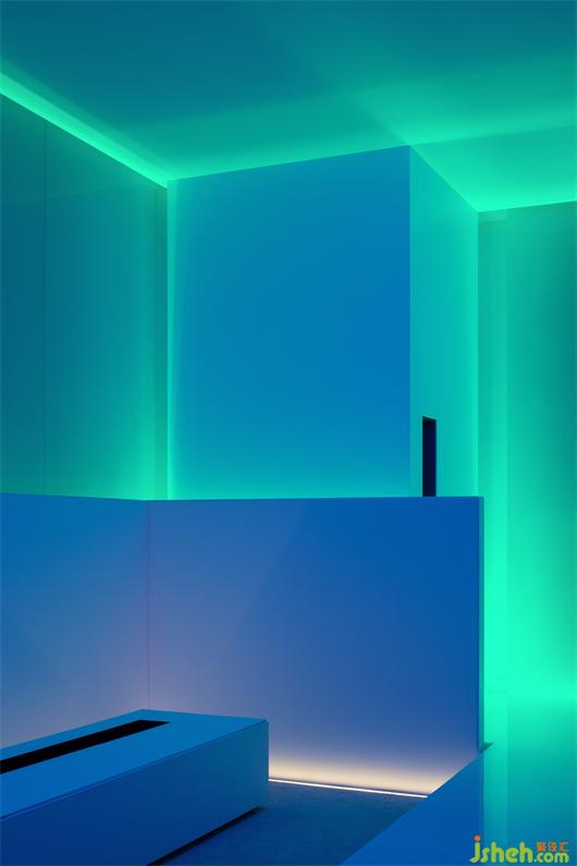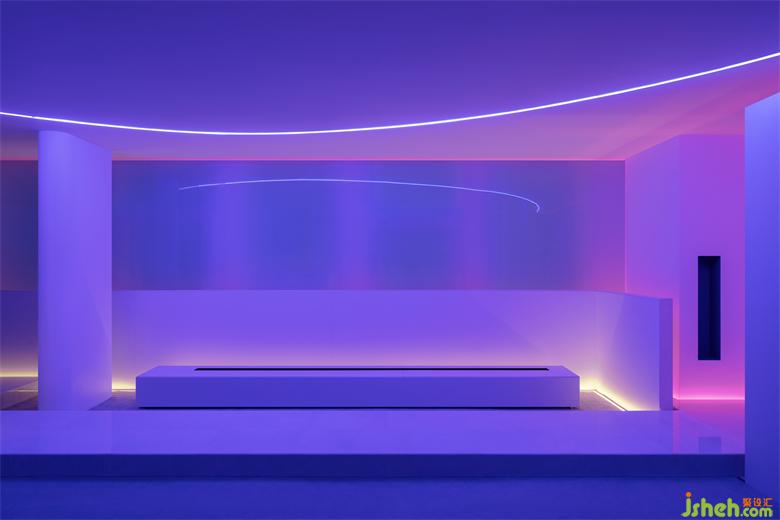 我們常常在想,在市場上充斥同質(zhì)化嚴(yán)重的白色空間、材質(zhì)單一的當(dāng)下,該如何營造空間內(nèi)的不同情緒表情。我們利用RGB延時燈帶來解決問題,當(dāng)夜晚燈帶投射到玻璃上留下漸變的色彩,呈現(xiàn)出另一種異常氛圍,極光、迷幻、未來都是空間感受的縮寫。我們可以去幻想這些玻璃變成了未來私宅的玻璃幕墻,提供一種新的建筑材料的構(gòu)想。室外的景觀可以隨意切換,在叢林深處,在荒蕪的星球,在幽靜的海底。無盡白晝的流星,宇宙黑夜嶄新的明亮,幻想不同天色情緒的豐富變化,關(guān)于炙熱、冷冽、張揚(yáng)克制、迷幻和真實(shí)。以光的變化去感受空間情緒的瞬變,空間包容的放肆的張牙舞爪,是等待回歸的宣泄后的平靜。