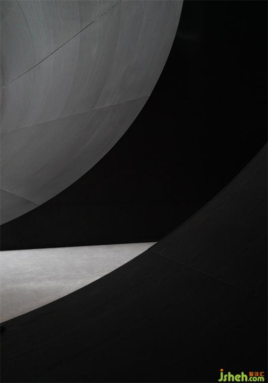 我們讓空間本身形成律動,用規(guī)則的傾斜梯形來營造未來空間的秩序,形成與純白光線的交織。在自然采光最好、最柔和的部分,規(guī)則傾斜的梯形既是收納的柜體又是空間形式的一部分,兼?zhèn)洳牧蠘影宓倪x樣工作。我們希望啟發(fā)消費(fèi)者,柜體并非只能呆板的樹立在空間中,它可以用我們希望的姿態(tài)存在。另一部分則保持著一種精神秩序,被1/4黑色木飾面弧形曲面包裹的靜謐,在頂部鏡面的折射下,圍合成一個半圓,在垂直的鏡面中,又形成無線延伸的深邃空間,空間本身會形成宇宙的律動,保持著一種黝黑所具有的無形的曠靜和陰翳。在這個空間下我們探討私宅書房、獨(dú)處、冥想空間的可能性??臻g的秩序形成了安全感,也是一種有力的釋放。我們在平和中靜觀,空間彌散的是自我存在的回聲,是自我在抗拒現(xiàn)實(shí)的引力,我們希望達(dá)成變化的永恒性,并且保持靜謐和純粹。