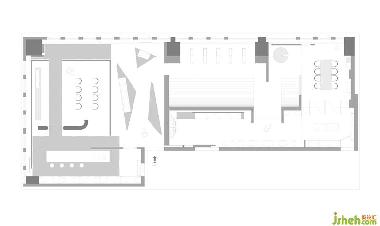 在營造廚房的傳統(tǒng)交互形式之外,我們建議甲方改變了廚房吊柜的產(chǎn)品形態(tài),利用智能升降五金,解決了常用吊柜450mm寬度門板縫隙的不美觀,解放吊柜形態(tài)的自由塑造。T臺步道連接了與廚房交匯的會客區(qū),而步道的排布圍合方式也自然地形成了獨(dú)立的會客區(qū)。利用T臺的形式,完成了建材供應(yīng)商與到訪設(shè)計師建立關(guān)系的分享聚會模式切換。在聚會模式下T臺變成了舞臺,為設(shè)計師分享交流會提供了形式場地。