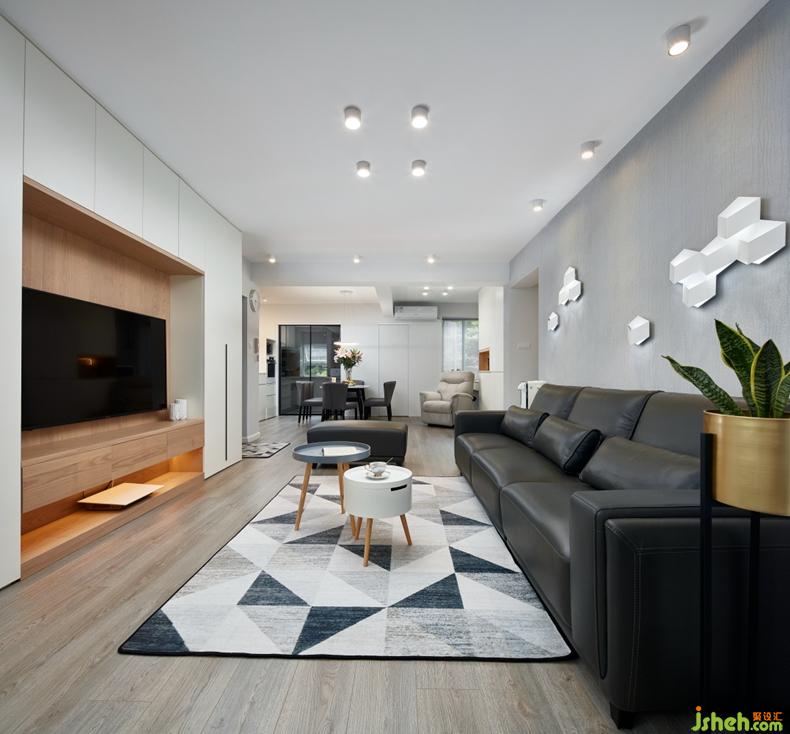 活動家具采用深淺冷色系搭配,改變大面積深色展現(xiàn)。深灰的皮沙發(fā),淺灰和白色的組合茶幾,中灰色調(diào)的藝術(shù)涂料背景,都被幾何圖案的灰調(diào)地毯襯托的更有清靜感。