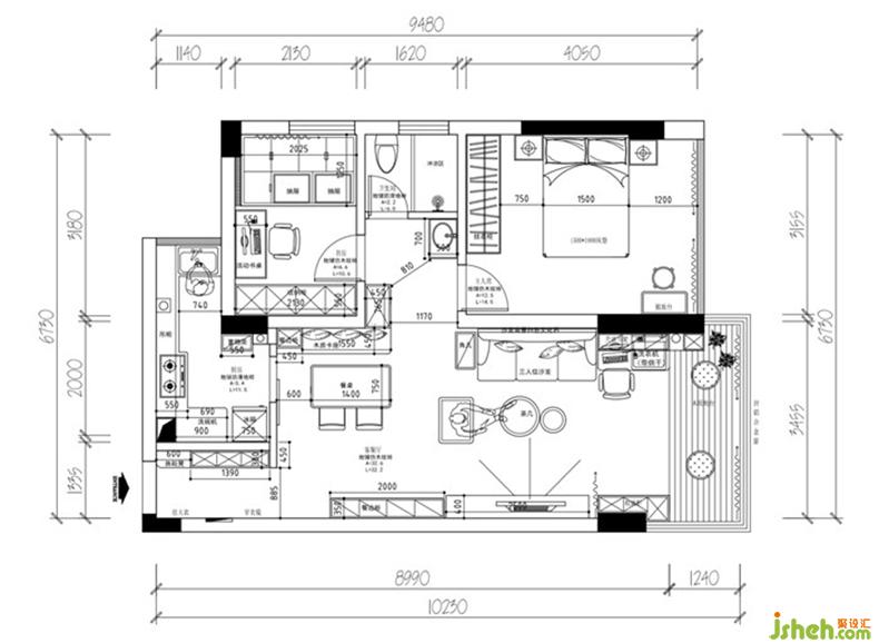 5,客廳與休閑陽臺打通,在喏小的的空間內(nèi)規(guī)劃出一個精彩的休閑空間(吧臺,休閑地臺,收納柜)。
