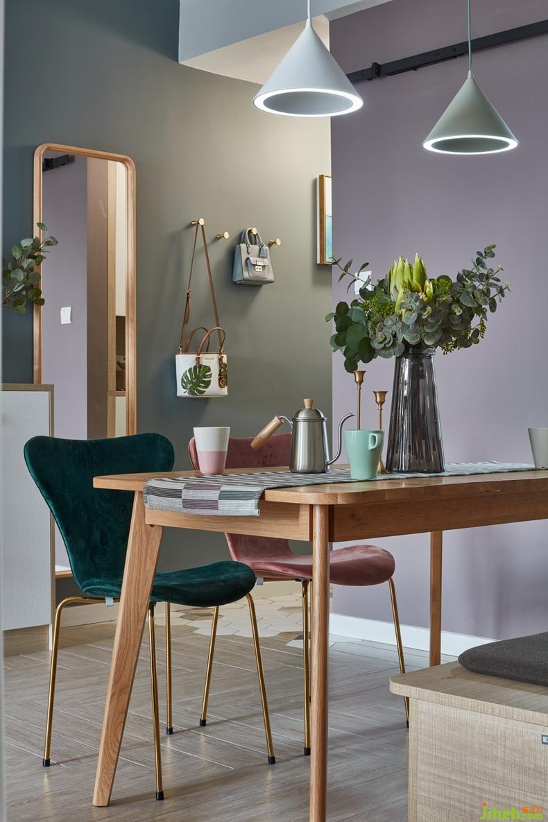 每個用色都不是憑空而來,入戶墻面的灰綠色與餐廳墻面的暖木棕,設計中色彩的撞色,更可以讓空間層次有了生動之美。