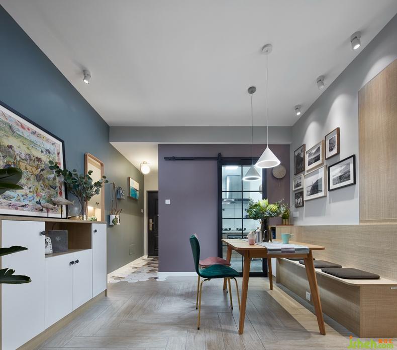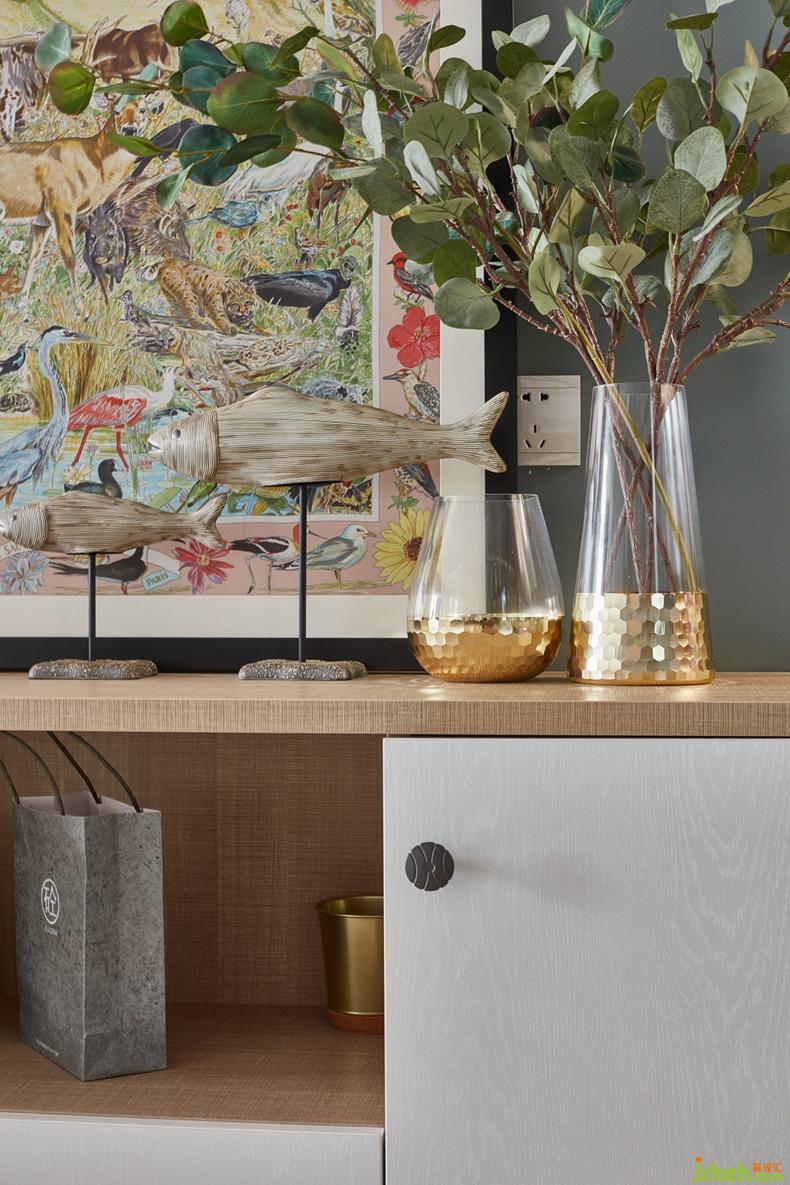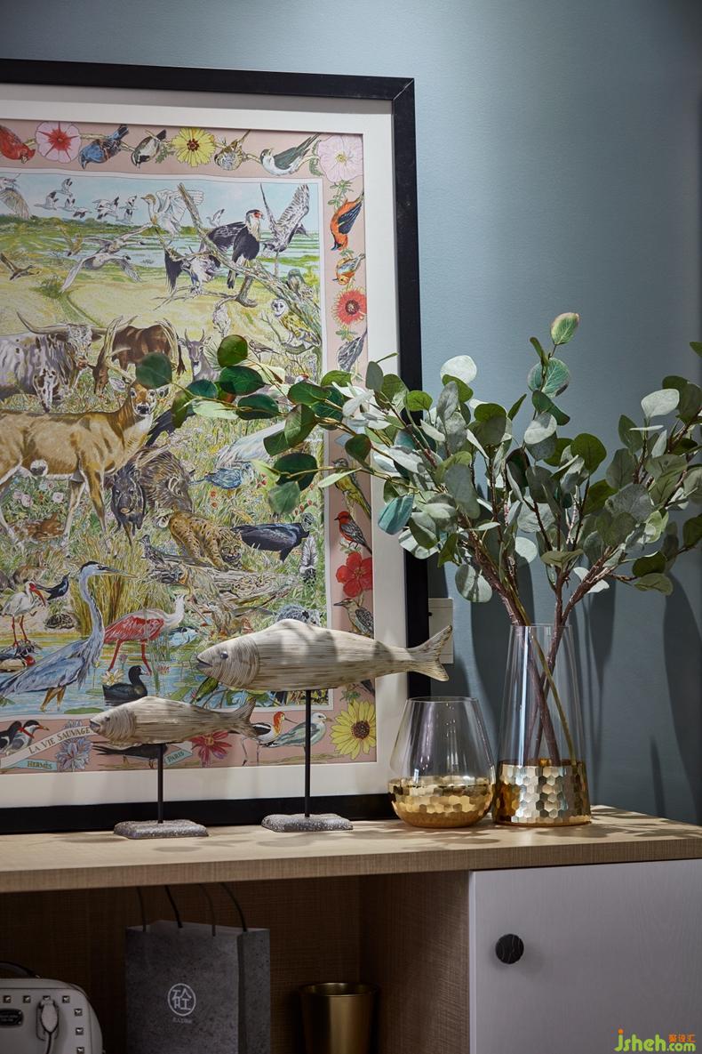 過道的餐邊柜,起到了玄關(guān)與餐廳的樞紐連接。桌面的絲巾畫是業(yè)主美眉從國外留學(xué)帶回來的,此時(shí)展現(xiàn)的不只是軟裝的搭配,更重要的是紀(jì)念意義遠(yuǎn)勝美境。設(shè)計(jì)公司