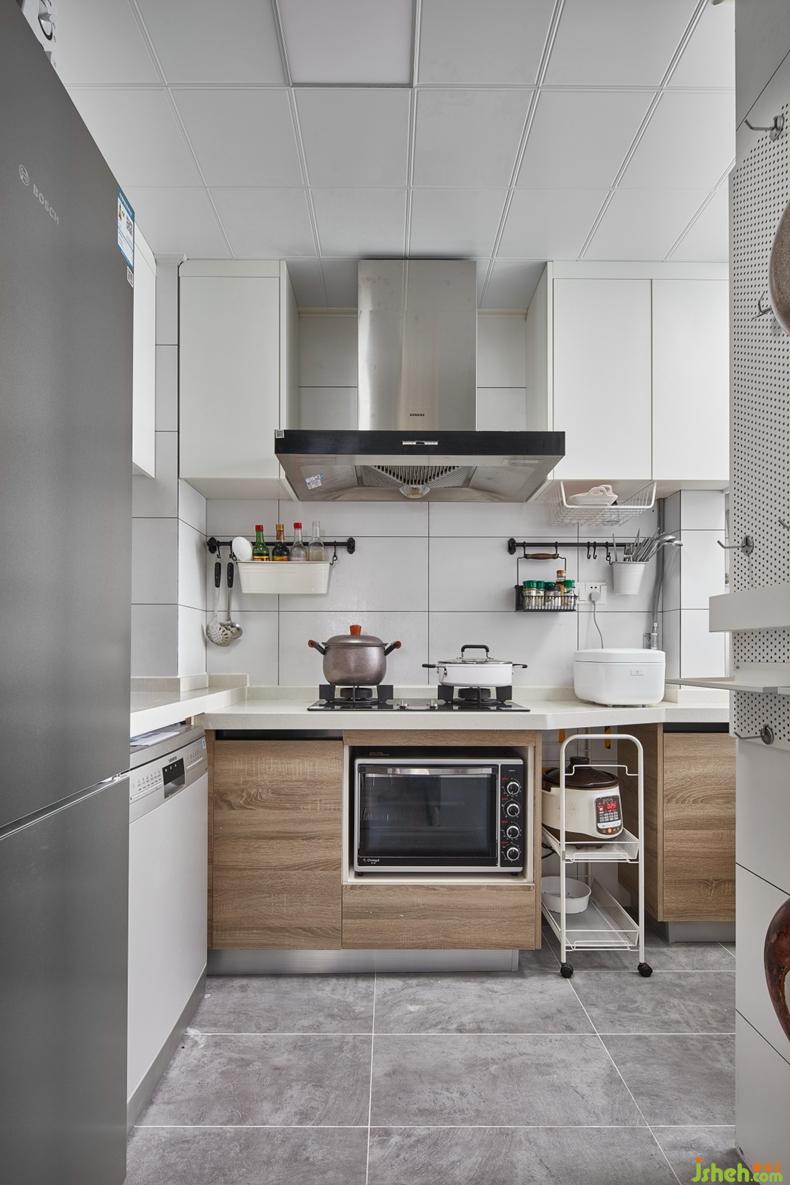 小小廚房空間,容納了冰箱,洗碗機(jī),烤箱,置物架。進(jìn)門右側(cè)墻面的洞洞板,強(qiáng)大的收納更是利用了立面空間。地柜的木紋色與白色吊柜搭配,讓小廚房也有美的搭配。