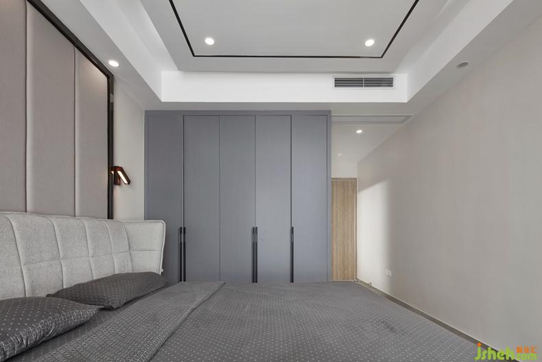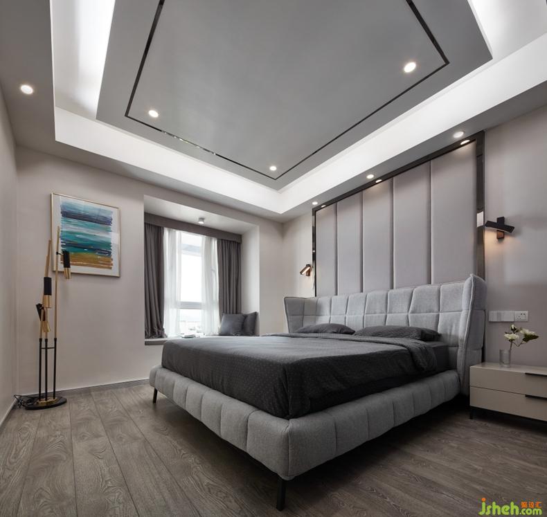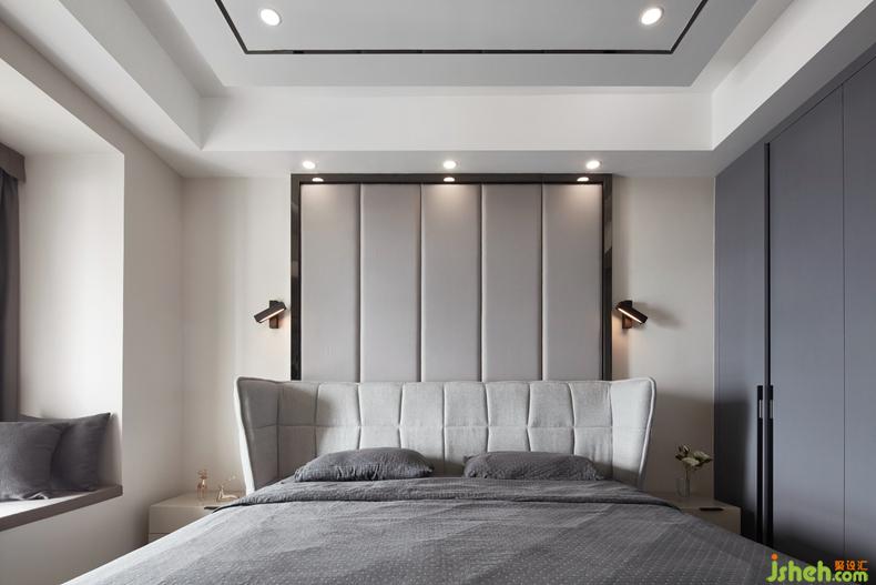 主臥設(shè)計(jì)中同樣取消主燈,天花吊頂設(shè)計(jì)中體現(xiàn)的暗藏?zé)魩?,讓空間的光照都是自然舒適。主臥背景采用軟裝設(shè)計(jì),簡(jiǎn)潔明快的線(xiàn)條呼應(yīng)天花吊頂,質(zhì)感的金屬收邊條更加體現(xiàn)輕奢的低調(diào)。