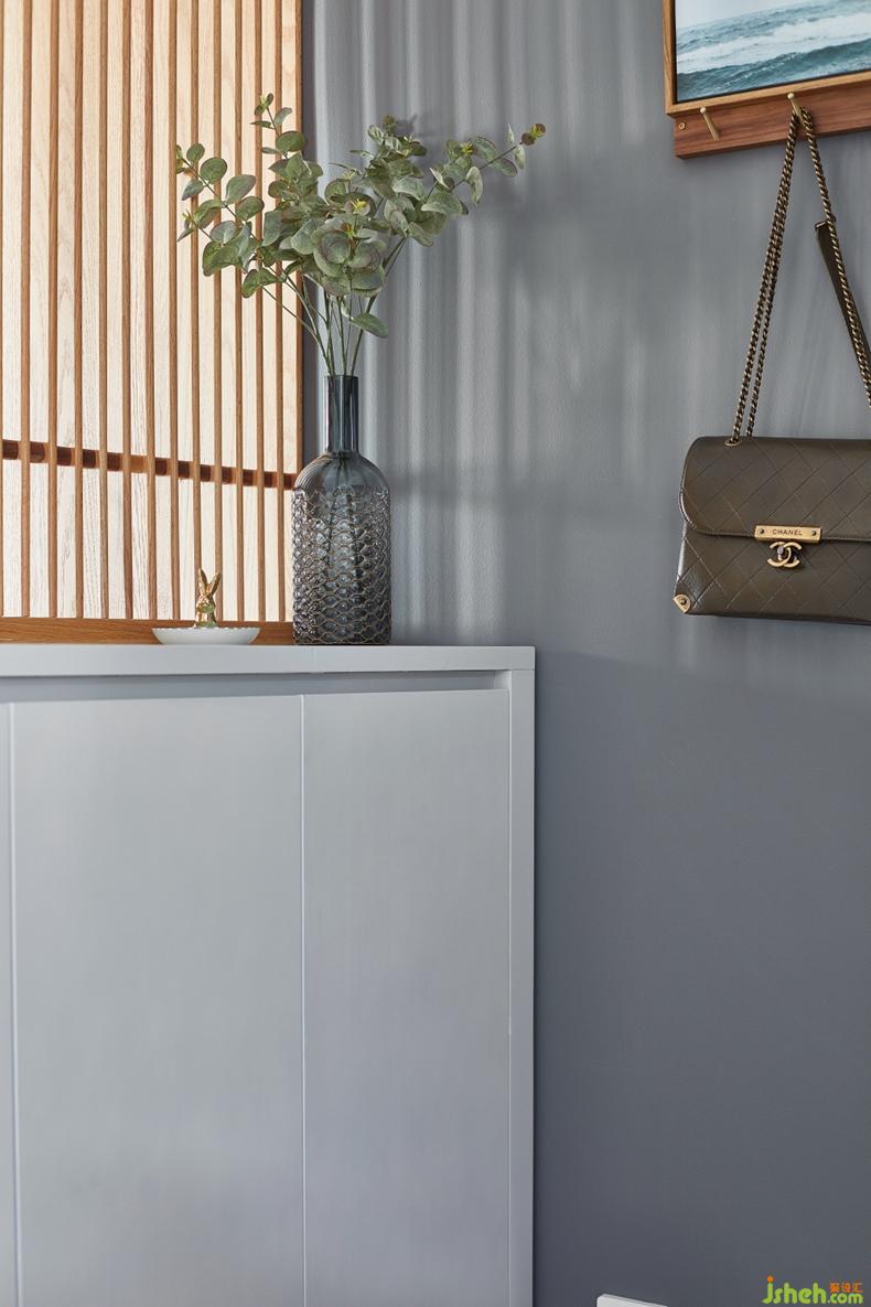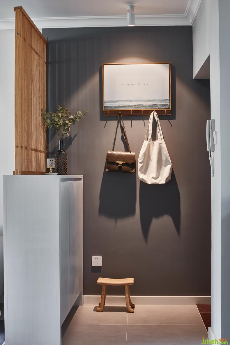 此處玄關(guān)位也是設(shè)計(jì)規(guī)劃里“偷”出來的空間。此區(qū)域空間雖小,但是功能容納不少,如:鞋柜,屏風(fēng),換鞋凳,掛衣鉤,黑板留言墻。由于入戶大門正對(duì)著現(xiàn)在客廳沙發(fā)位,從私密性來說,有個(gè)間隔的設(shè)計(jì)會(huì)緩解面對(duì)大門的尷尬。同時(shí)屏風(fēng)設(shè)計(jì)中又考慮到通風(fēng)的效果,在鞋柜上半部采用實(shí)木豎條格柵來做屏風(fēng),有間隔同時(shí)又保證通風(fēng),原木的質(zhì)感也呼應(yīng)進(jìn)入客廳的背景原木地板。深圳設(shè)計(jì)公司