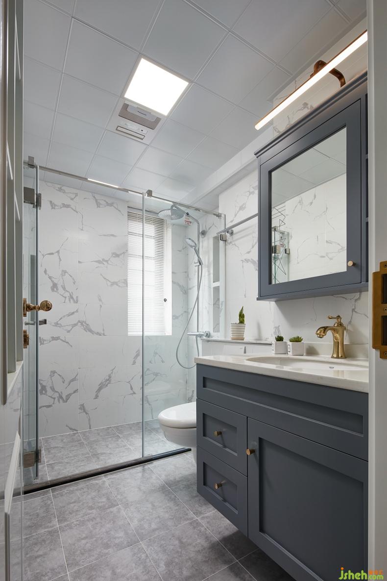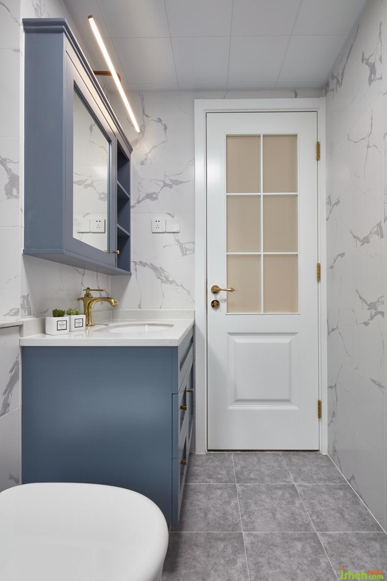 墻面統(tǒng)一的仿爵士白瓷磚,自然的紋理不需要刻意挑選,隨意的混鋪更加能體現(xiàn)自然的延伸。定制的灰藍(lán)色洗手臺(tái)配上金色水龍頭,此時(shí)金屬的質(zhì)感最容易讓人流連忘返。