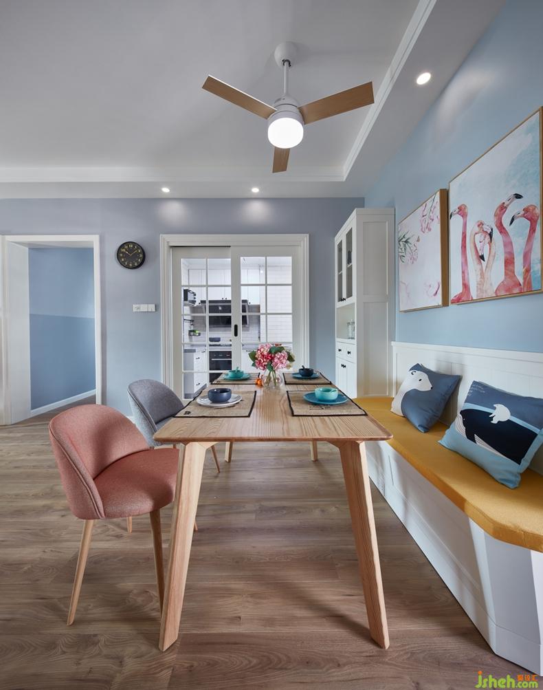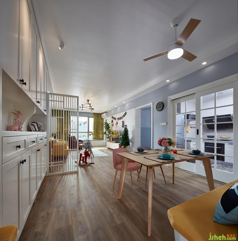3,色彩搭配上主色調(diào)采用清爽的灰藍(lán)色調(diào),主要考慮戶型的朝向和西曬,設(shè)計(jì)的細(xì)心不能一位的紙上談兵,再美也脫離不了實(shí)際落地。