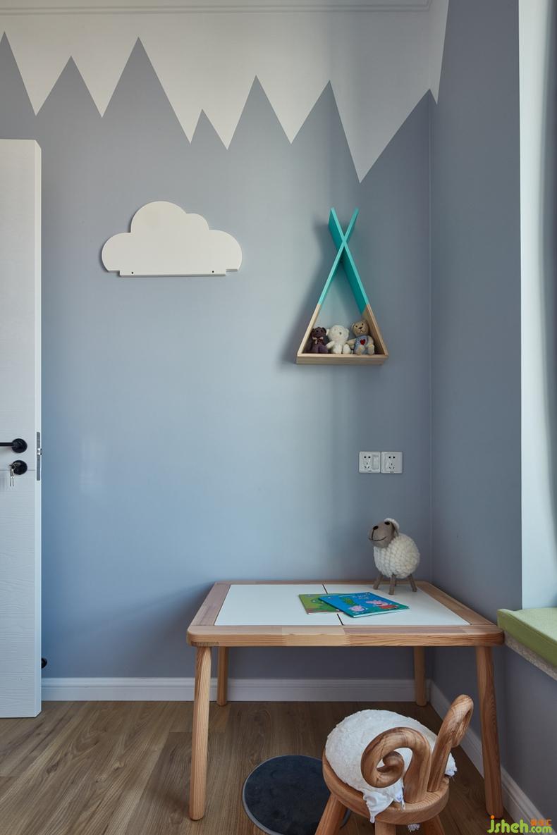 兒童房:墻面在涂料滾涂的上設計充滿童趣的幾何圖案,有山的變幻,有白云的浮現(xiàn),有孩子一切的童真幻想?;疑{的墻面做為背景,粉色可愛的家具帶給小女孩公主粉的世界。