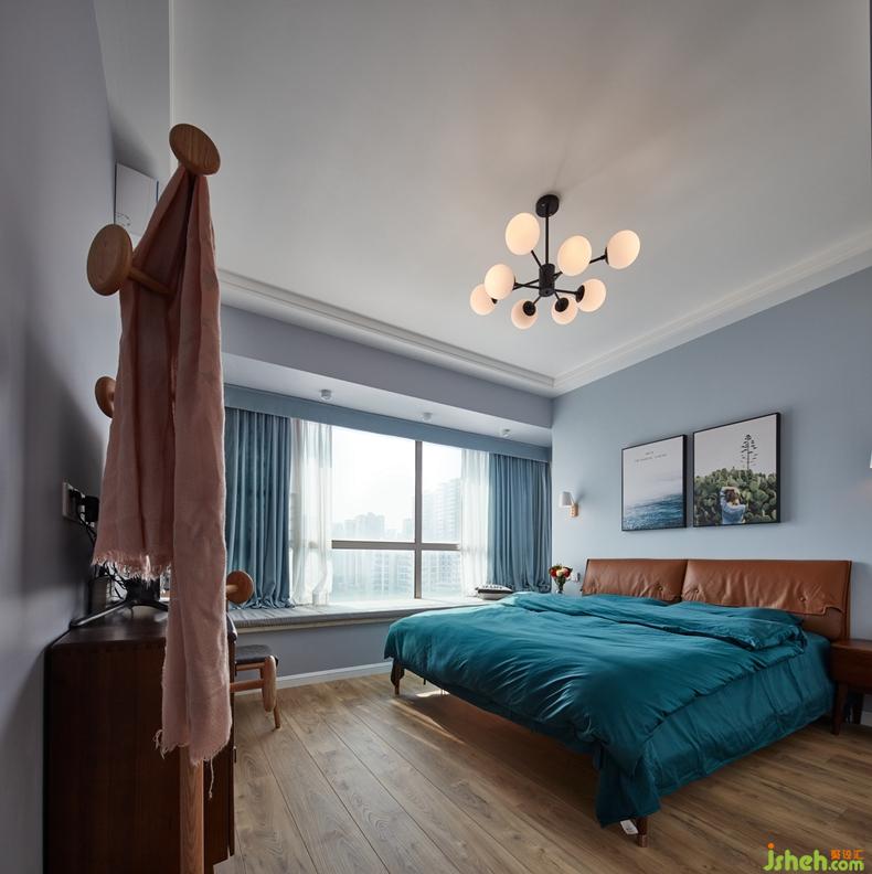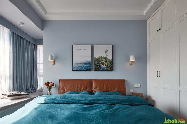 主臥:墨綠的床品主色與床頭掛畫的山景海景呼應,給臥室?guī)淼氖悄瞧泄适碌男腋.嬅?。夕陽西下,坐擁在沙灘,一切美好的故事都有期待的暢想?