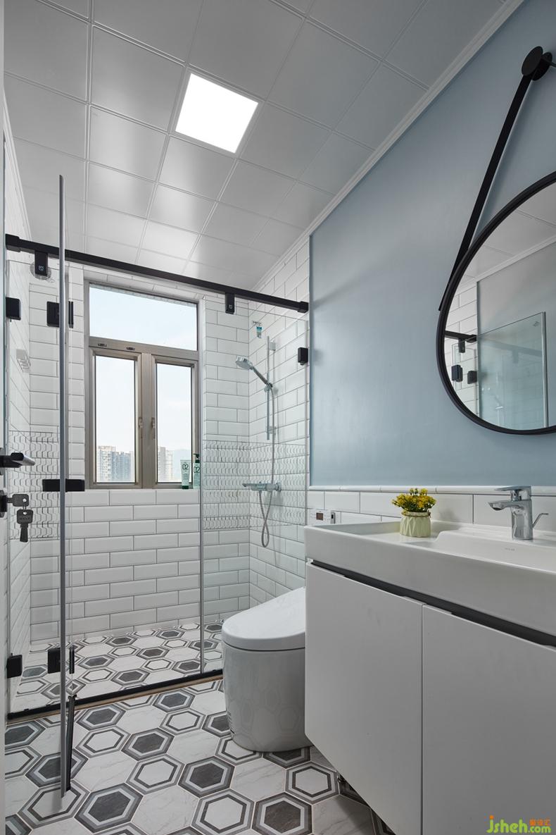 主衛(wèi):在材料的選擇搭配上充分考慮空間的獨特性,沖涼區(qū)采用滿鋪小條白磚(滿足沖涼的水及潮氣最大的使用區(qū)域),而在馬桶及洗手臺區(qū)域墻面則采用半高底部貼瓷磚,上半部刷防水涂料,誰說洗手間就是一成不變的貼磚再貼磚?地面的六邊形磚,圖案的變幻,更加體現(xiàn)出主人對于生活細節(jié)的要求。