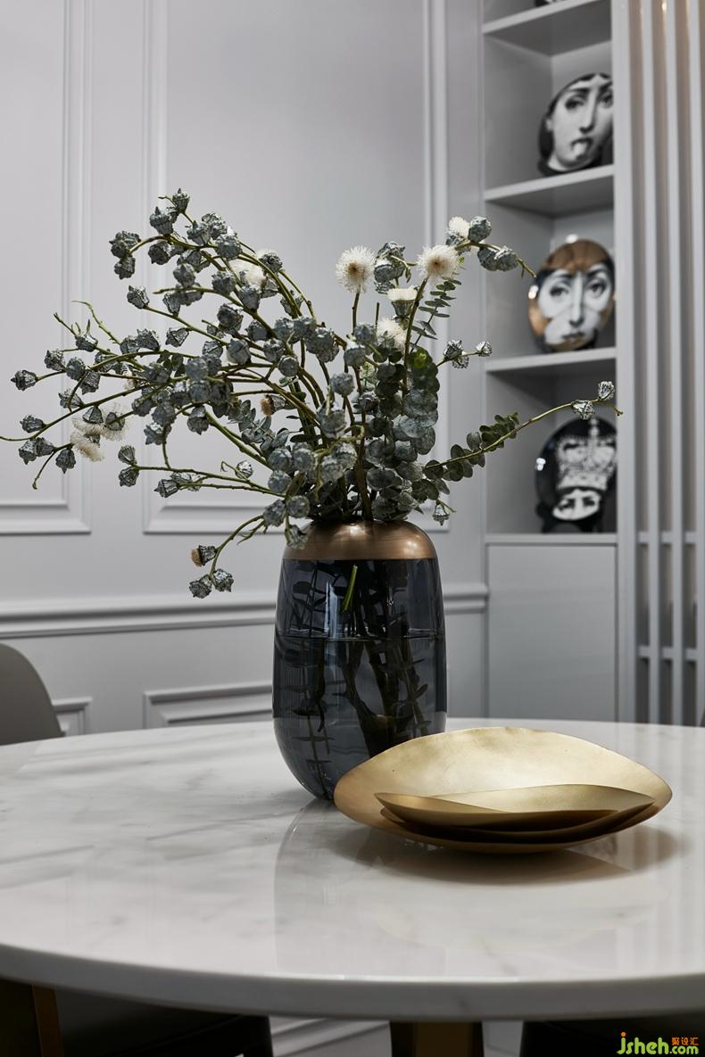 餐桌上方那充滿輕盈韻律的吊燈,給整個餐廳帶來簡約的輕奢質(zhì)感,光,影互動,猶如天上留下的銀河,讓人垂涎欲滴之感。巧妙利用的空間“偷來”的餐邊柜,裝飾盤的圖案更加呼應(yīng)出餐廳讓讓人流連忘返的美。