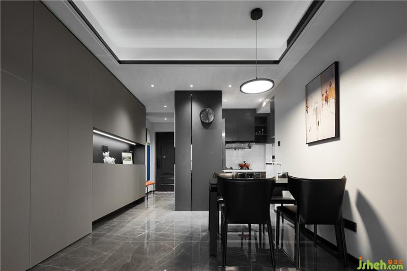 餐廳純黑色的餐桌椅搭配,頂部一個簡潔圓盤吊燈,光的重點烘托就餐氛圍。餐廳不需要花哨,更不需要燈光過剩。就餐區(qū)燈光的凝聚感設(shè)計,可以滿足餐廳的儀式感。