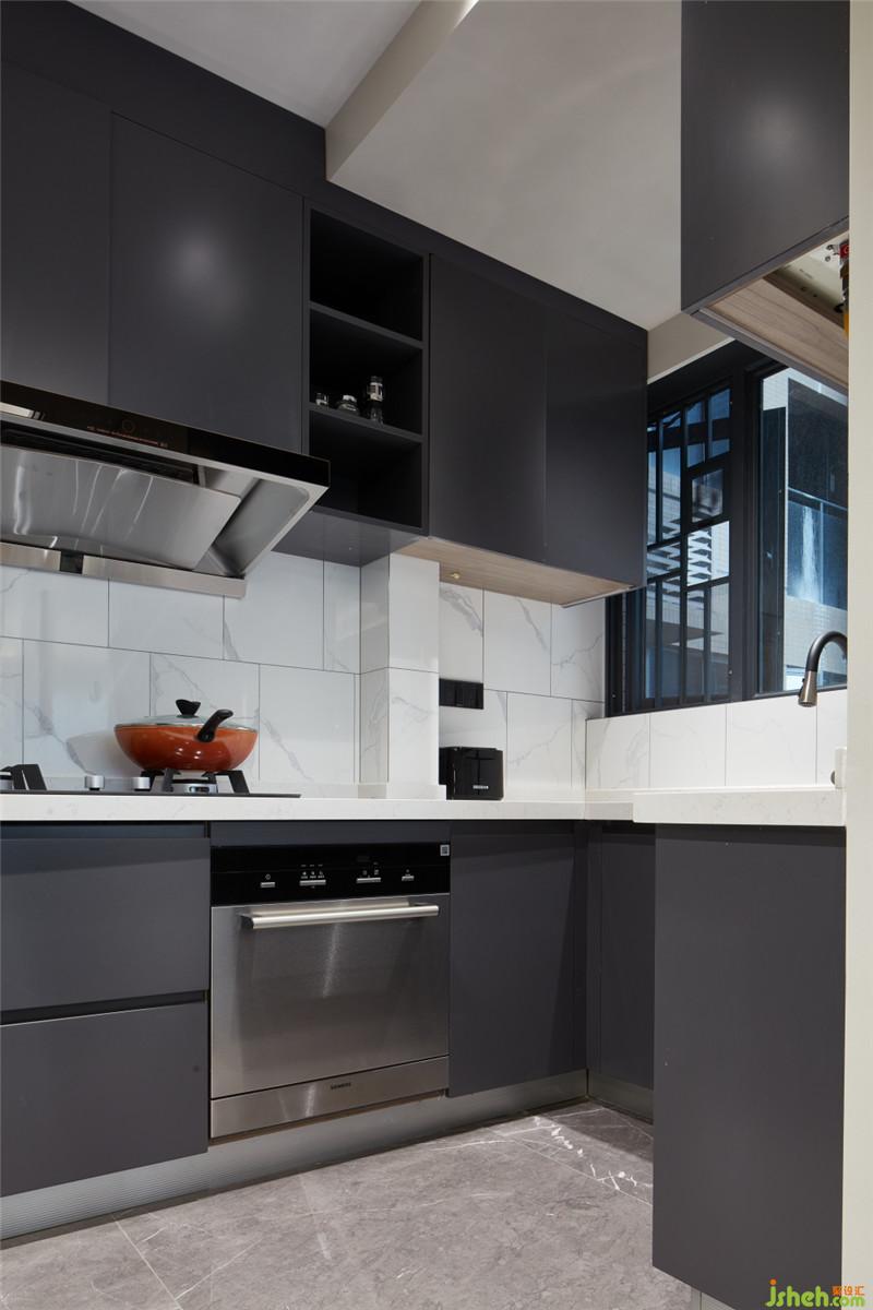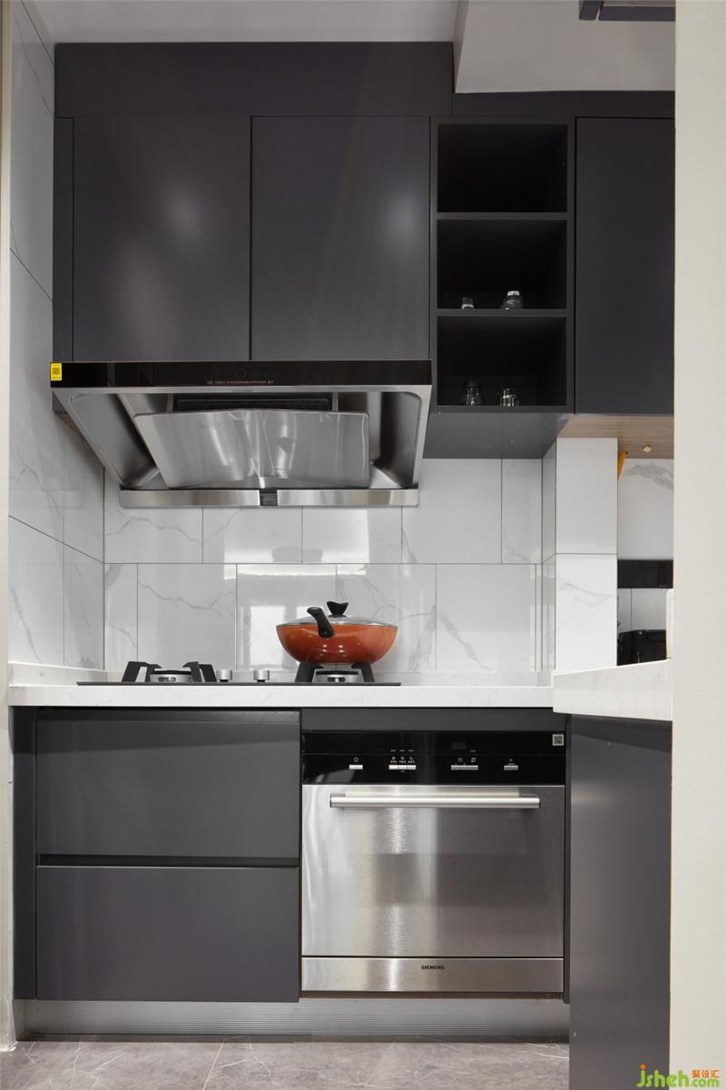 廚房沿用客餐廳色系,給廚房與餐廳間的協(xié)調(diào)增加整體感?;疑喖s無拉手柜門,仿爵士白瓷磚的灰色紋理與柜門既有對比又有呼應(yīng),美體現(xiàn)在看似不經(jīng)意的細(xì)節(jié)中。