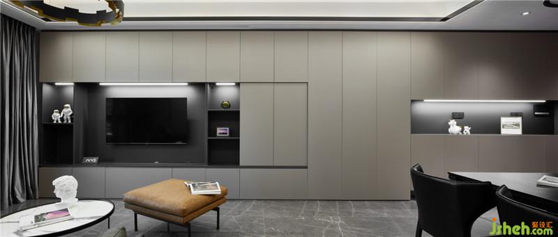 客廳沙發(fā)背景墻的豎塊狀硬包背景,布藝的細(xì)膩質(zhì)感與電視組合柜的硬朗形成對比。硬包邊上黑色的金屬收邊條又與電視背景柜中的黑色呼應(yīng),視覺的整體效果,需要在材質(zhì),色彩,造型等方面都要全面考慮。