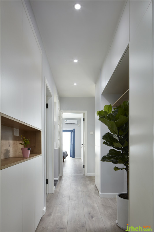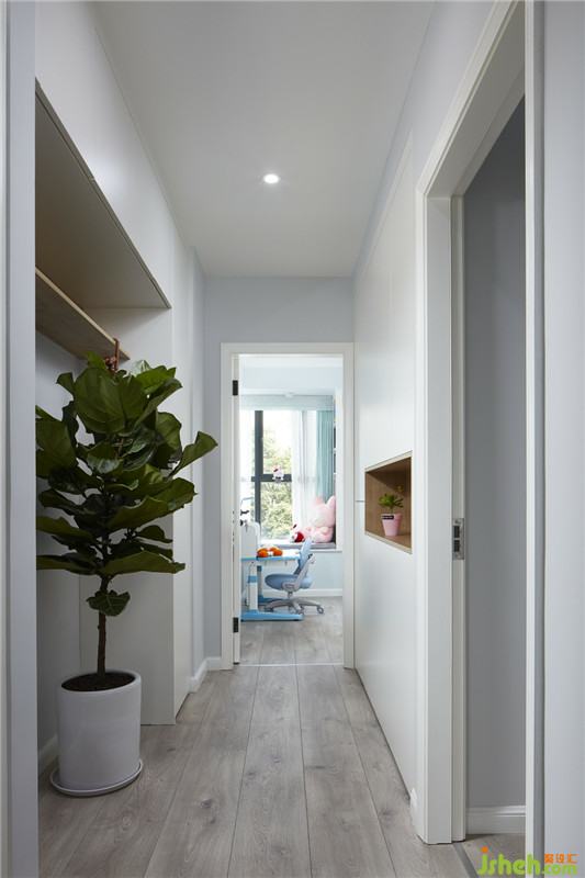 主衛(wèi)的舍棄,給予了多功能衣帽間的空間。書桌靠窗,左右兩側(cè)做書架收納,方便實(shí)用滿足了書房的需求。 書桌右側(cè)書架的背面,利用柜子的深度,做了一面收納書架,又完全滿足梳妝臺(tái)的收納需求。每個(gè)空間都有各自的需求,每個(gè)空間又可以完美的發(fā)揮作用。