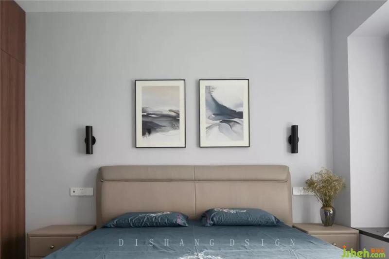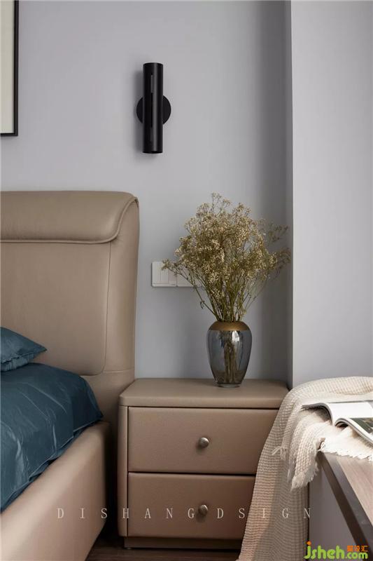 米色系的簡約真皮大床與床頭充滿質(zhì)感,配以柔軟舒適的藍色床品,不論是顏色還是材質(zhì)上,對比明確,但卻具有舒適與美觀并存的享受。室內(nèi)設計師