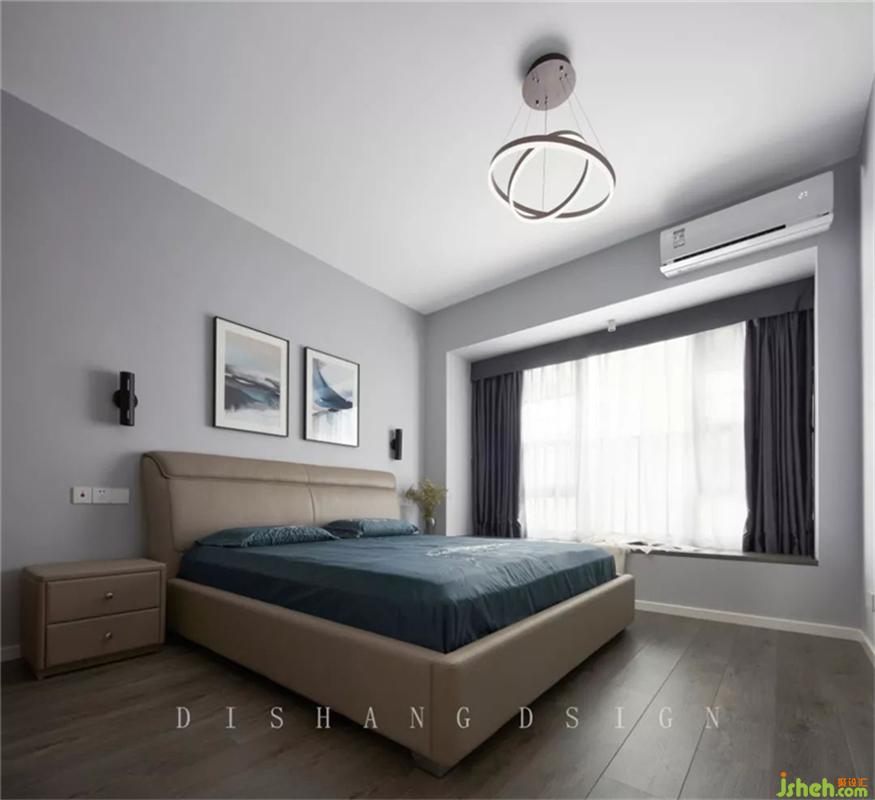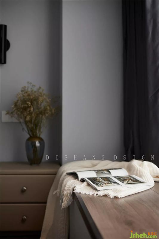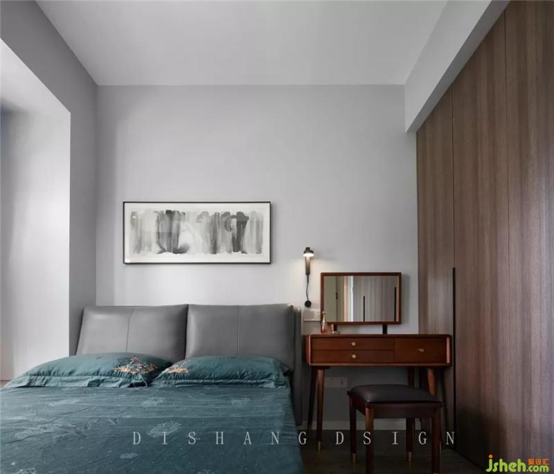 次臥黑胡桃木梳妝臺、藍色床品與淺灰色產(chǎn)生強烈的對比,給人一種時尚前衛(wèi)的感覺。室內(nèi)設計師