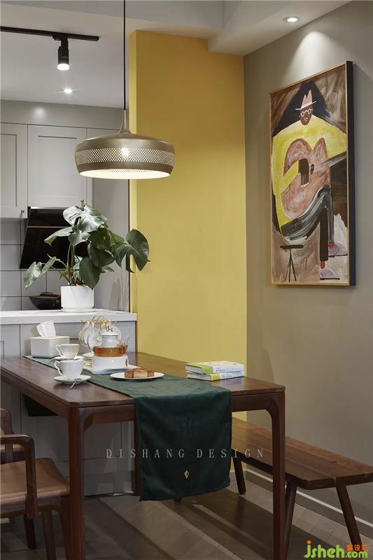 廚房的旁邊便是餐廳。原戶型在視覺上給人感覺非常狹隘,開放式廚房與餐廳相連在視覺上得到延伸,也帶來了親子溝通便利。裝修設(shè)計
