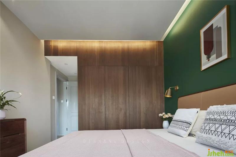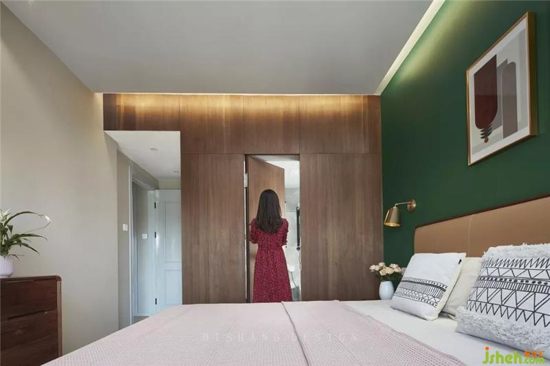 我們通過設(shè)計(jì)調(diào)整主臥與主衛(wèi)之間的連接,把主衛(wèi)門做成黑胡桃KD隱形門,隱藏于墻壁中,延伸視覺的同時(shí)又有整體裝飾作用。臥室自然清新,優(yōu)雅且富有質(zhì)感的雙人床舒適宜人。裝修設(shè)計(jì)