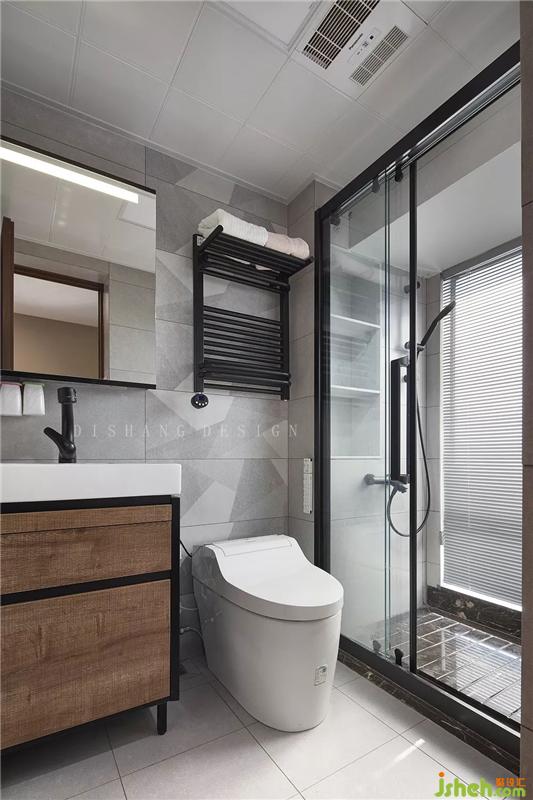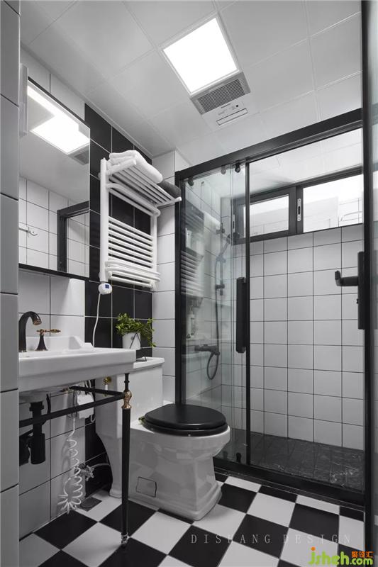 主衛(wèi)和次衛(wèi)都做了干濕分區(qū),利用玻璃門進(jìn)行隔斷。兩者不同的是在色彩上的運(yùn)用。主衛(wèi)是淺色調(diào)白色為主,搭配黑胡桃實(shí)木洗手臺(tái)柜,增強(qiáng)空間的明亮度與收納功能;公衛(wèi)則運(yùn)用黑白兩色穿插整個(gè)空間,對比非常鮮明,卻富有vintage情調(diào)。裝修設(shè)計(jì)