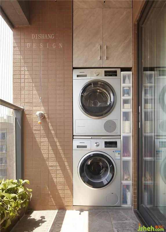 陽臺(tái)雖小卻“五臟俱全”,最大化利用客廳陽臺(tái)的實(shí)用性,將洗衣機(jī)、干衣機(jī),洗手臺(tái),拖把池,收納組合柜,就連洗衣機(jī)與墻體間的縫隙也充分利用收納。裝修設(shè)計(jì)