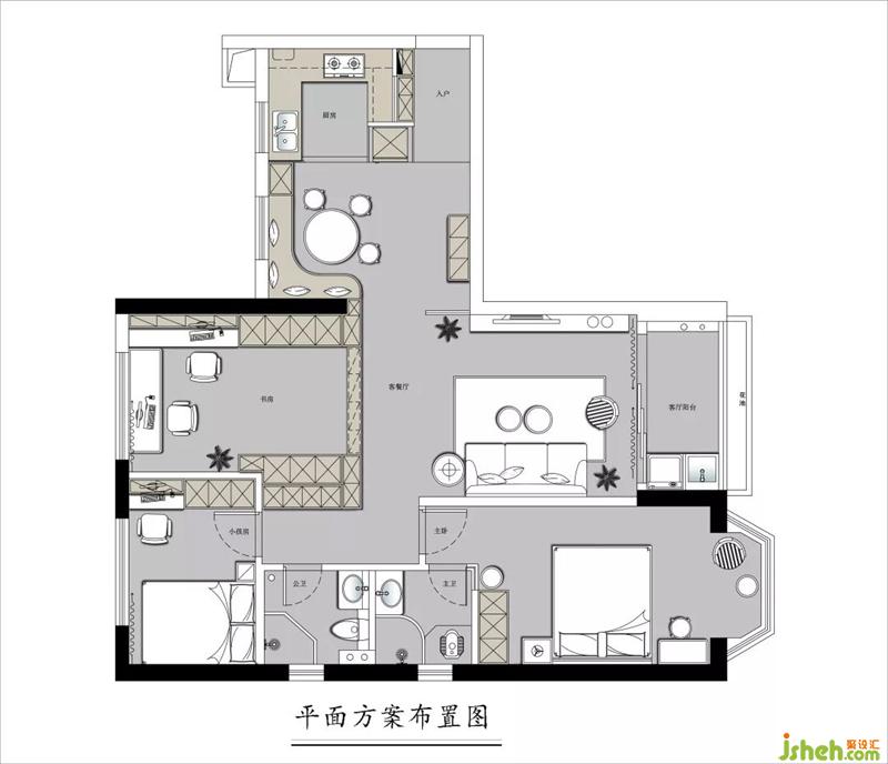 巧妙利用過道與廚房相連的墻體做局部鏤空采光;冰箱非常規(guī)放置,增加空間靈活度;餐廳空間不大,靠墻弧形卡座極大拓展實用性;書房的半通透設(shè)計,給客廳與書房帶來空氣對流。