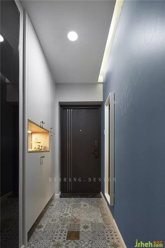 入戶過道狹小采光極弱,設(shè)計師利用過道與廚房的連體墻,設(shè)置通頂白色鞋柜,中間使用透明玻璃做局部鏤空,自然光線通過廚房窗口照射到過道,打在全身鏡面上,柔和的微光交相呼應(yīng),過道變得溫柔、明亮起來。