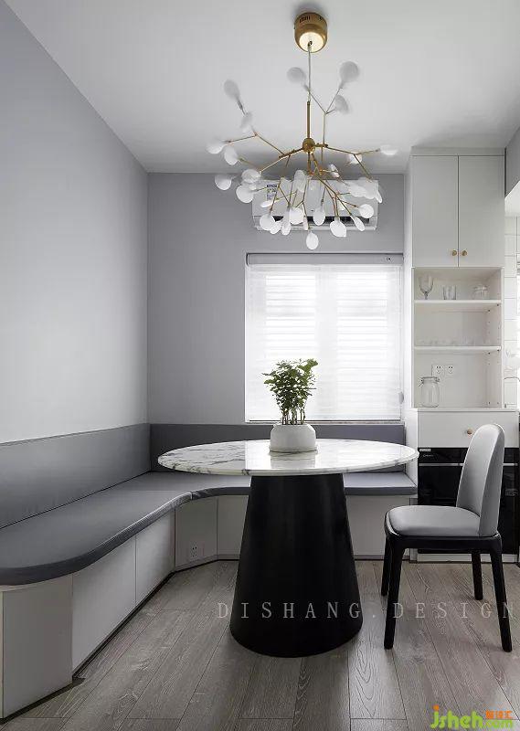 ▲線條柔和的卡座,簡約的大理石巖板餐桌,就像家一樣純粹,而樹枝狀的吊燈,就像家人一樣緊密連在一起,力量才會更加凝固,亮度才會增強。