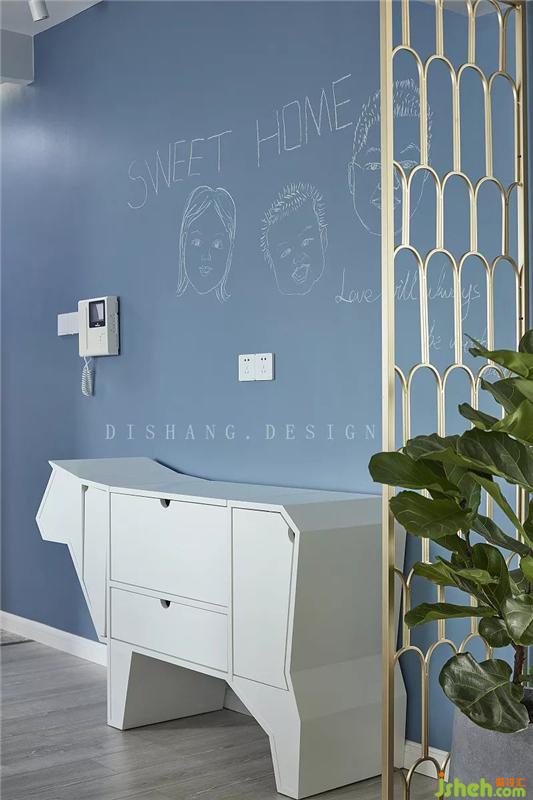 餐飲區(qū)對面卻是非?;钴S、可愛的一角,白色的奶牛餐邊柜,造型獨特可愛;靜謐藍色墻壁上手繪著“我們這一家”的卡通畫,簡約的線條,卻勾畫出一家子的“Sweet” & “Love”,非常的柔軟,這不僅是溫度,更是一種對生活的態(tài)度。