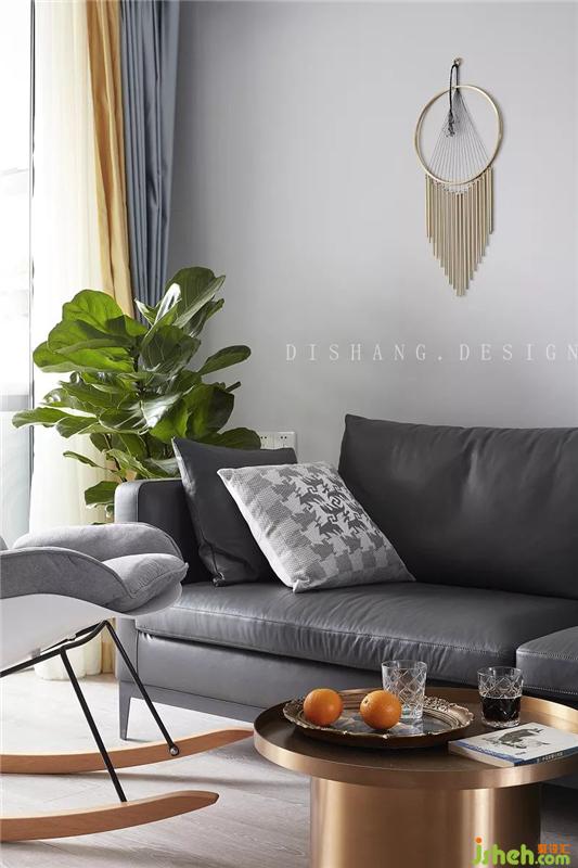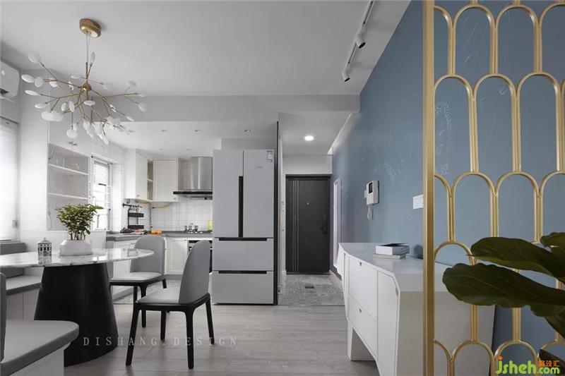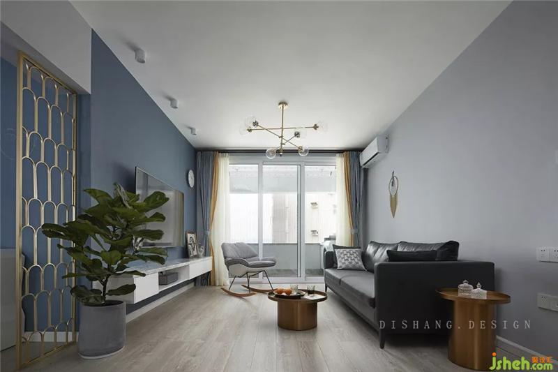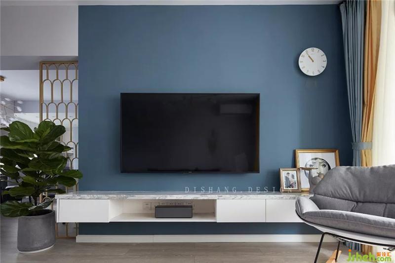 明的色彩塑造出自己的家。無論是直線硬朗的電視儲藏柜、金屬吊燈、相框,還是擁有柔軟弧度的茶幾、單人椅、鐘表、金屬掛進,線條都非常簡明,在這個空間里既柔和又有一種對抗美;而藍色與金屬色的鮮明色彩對比,空間靈活,富有生氣。