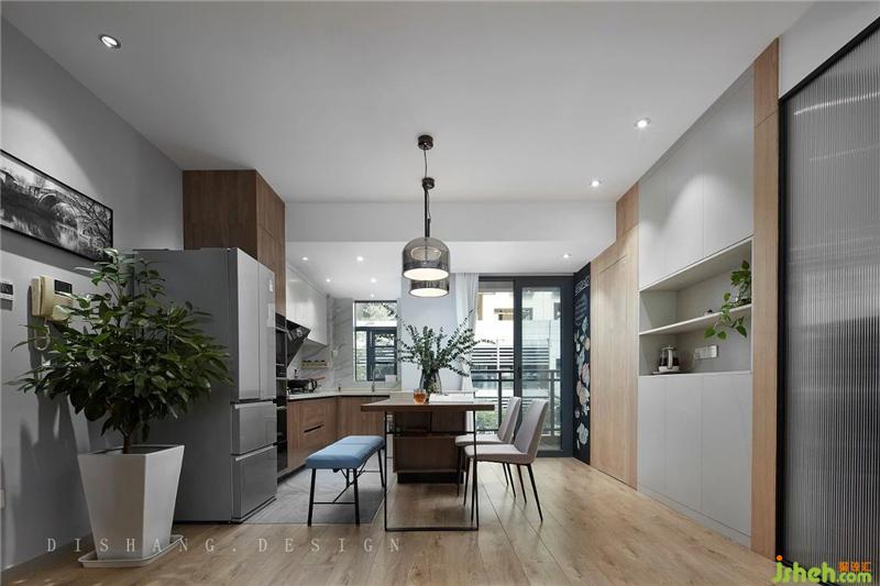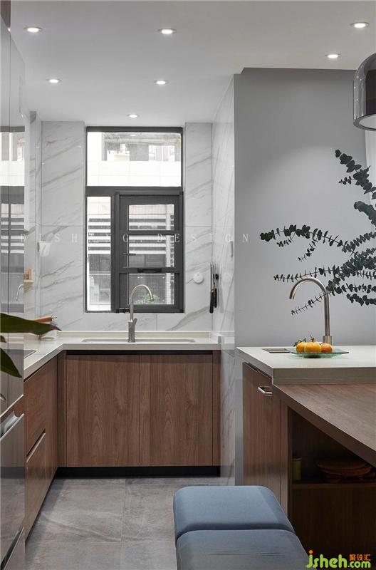 開放式廚房加強(qiáng)餐廚兩個(gè)區(qū)域的互動(dòng)性,空間之間產(chǎn)生對(duì)話;而島臺(tái)的設(shè)計(jì)使餐廚連接得更加完美無暇。裝修設(shè)計(jì)