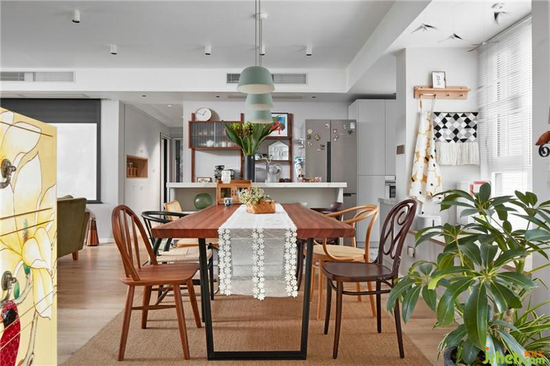 3,餐廳島臺連接廚房與餐桌,加長整木餐桌增加使用的無限可能