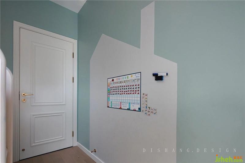 清新的小孩房,整面墻壁設(shè)計(jì)成Growth Plan,有助于小孩從小養(yǎng)成獨(dú)立、設(shè)立目標(biāo)的性格。室內(nèi)設(shè)計(jì)師