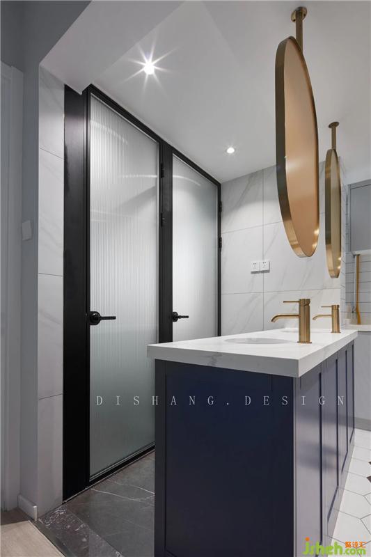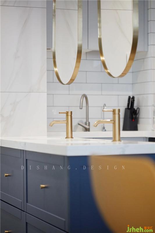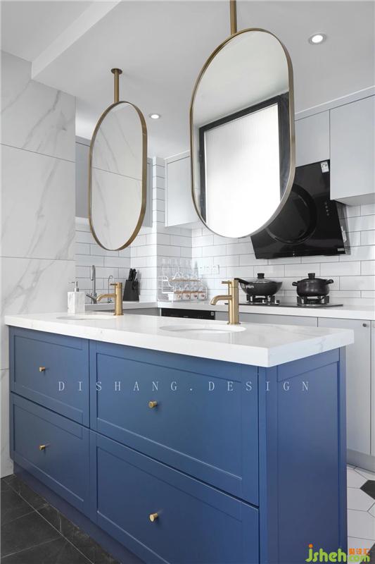 廚房的對(duì)面同樣是“開(kāi)放式”的衛(wèi)生間,將洗手臺(tái)設(shè)置在廚衛(wèi)間,有效的劃分的區(qū)域;寶藍(lán)色的洗手臺(tái)柜子、金色的水龍頭、懸吊式金屬邊框鏡子,給廚衛(wèi)空間增添些許生動(dòng)的色彩。室內(nèi)設(shè)計(jì)師