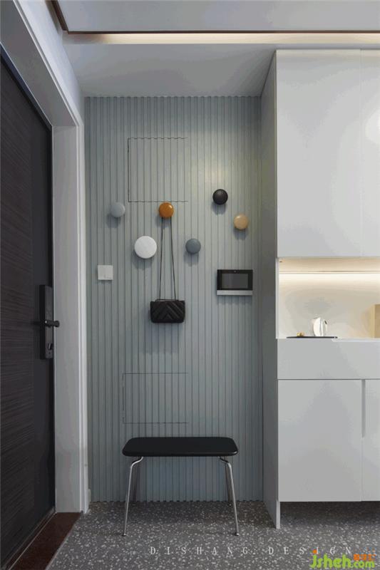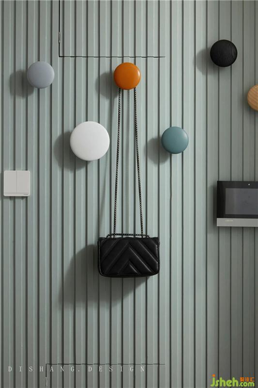 入門(mén)處貼實(shí)木線條設(shè)計(jì)成隱形版本,把總開(kāi)關(guān)等隱藏在線條后,空間整潔利落;莫蘭迪色系裝飾大頭釘錯(cuò)落有致分布在實(shí)木線條板上,不僅起到裝飾作用,又可以將近期常用的外套、包包、絲巾等物品掛在上面,方便又實(shí)用。