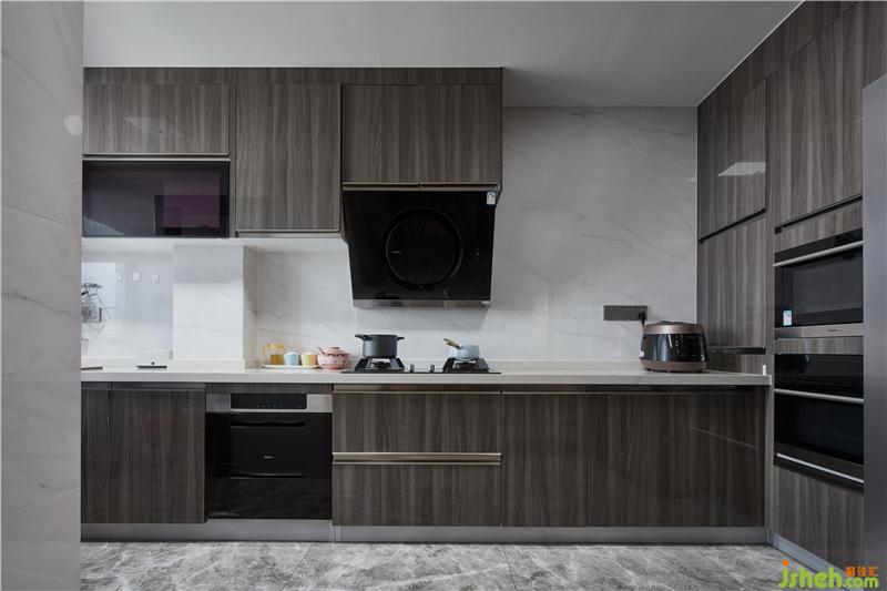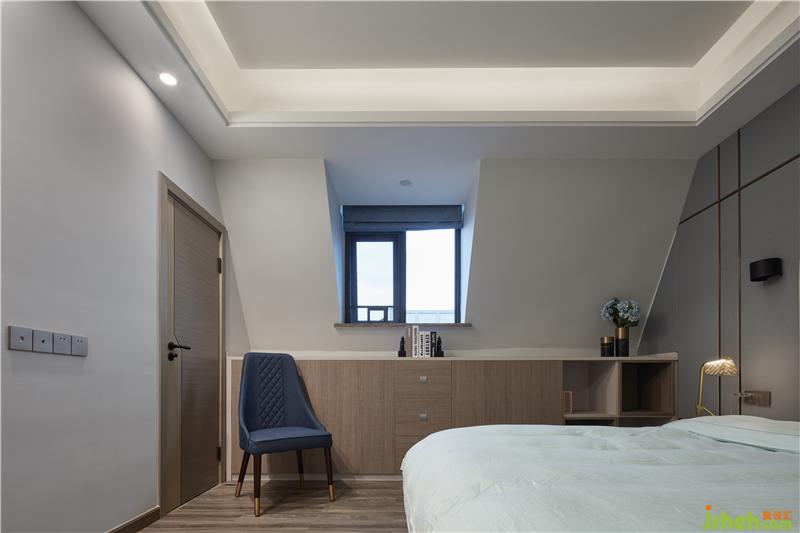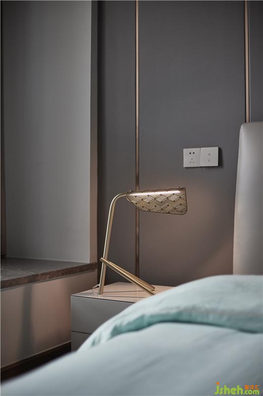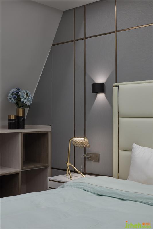 木色與灰色墊定了整體空間的兩大基調(diào),灰中透著輕盈,質(zhì)樸中彰顯高級;背景墻由灰色硬包加金屬條鋪陳,營造現(xiàn)代氛圍,在床頭壁燈的呵護下,以柔和被褥作映襯,渲染一種親和淳樸、安享自身的人生態(tài)度。