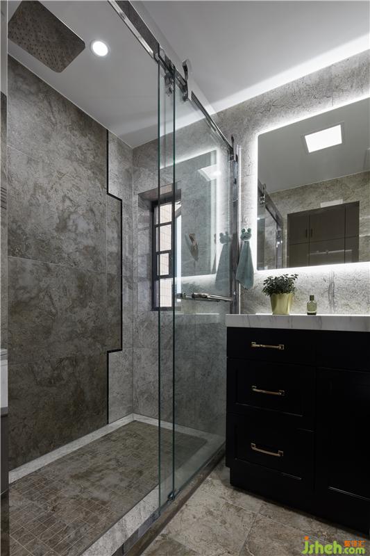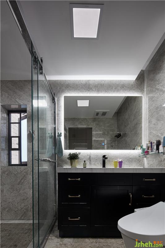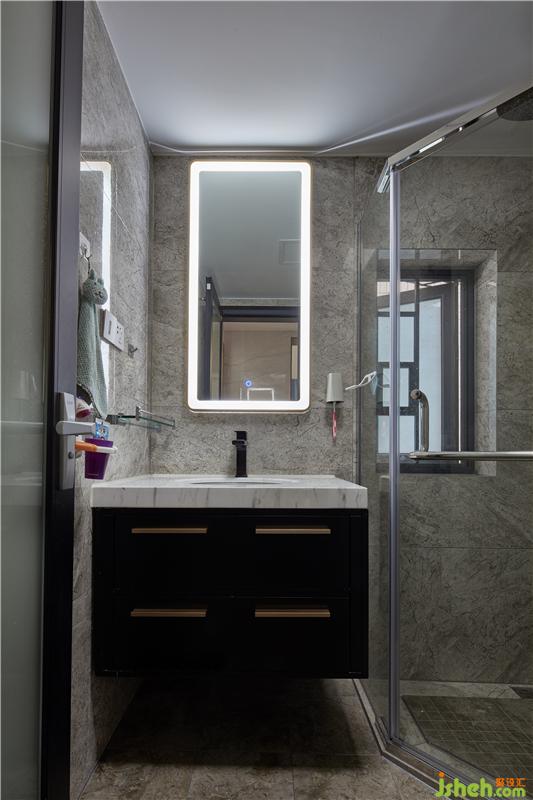 衛(wèi)生間以簡潔的灰色大理石瓷磚搭配,整潔舒適,黑色的浴室柜點綴其中,于現(xiàn)代極簡主義中流露出寫意之美,簡雅而素淡。