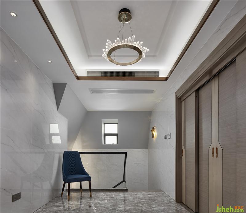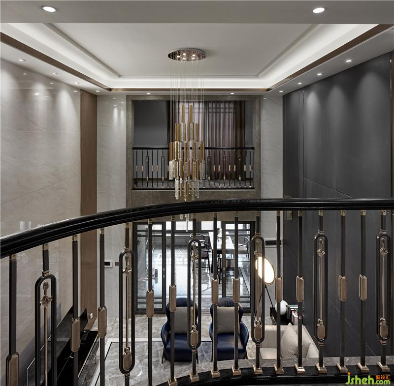 挑高的樓梯區(qū)將精致的生活格調(diào)層層鋪開,利落的線條伴隨暖色光線充盈其中,表達精致的空間訴求。室內(nèi)設計師選擇金屬材質(zhì)的燈具,在人與人的連接中,帶來一絲暖意與高雅之感,串聯(lián)起室內(nèi)的情感主線。