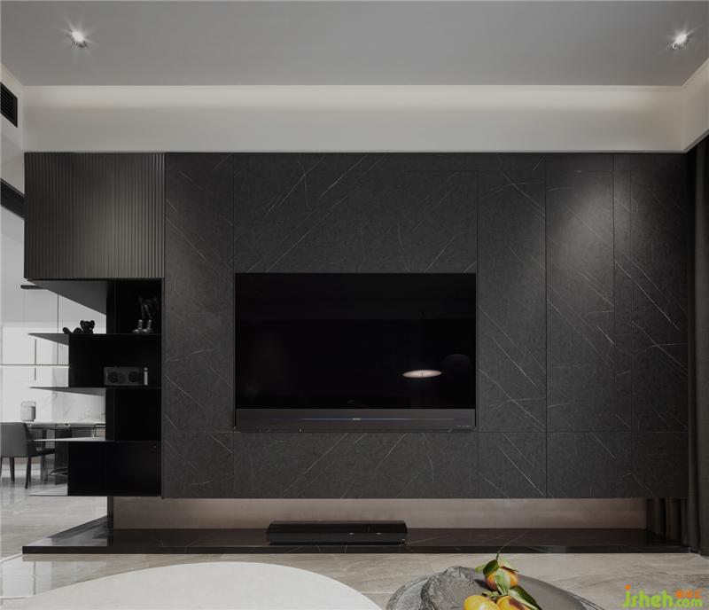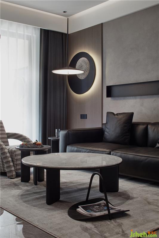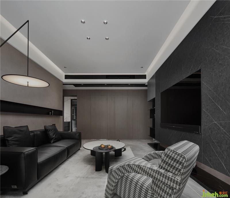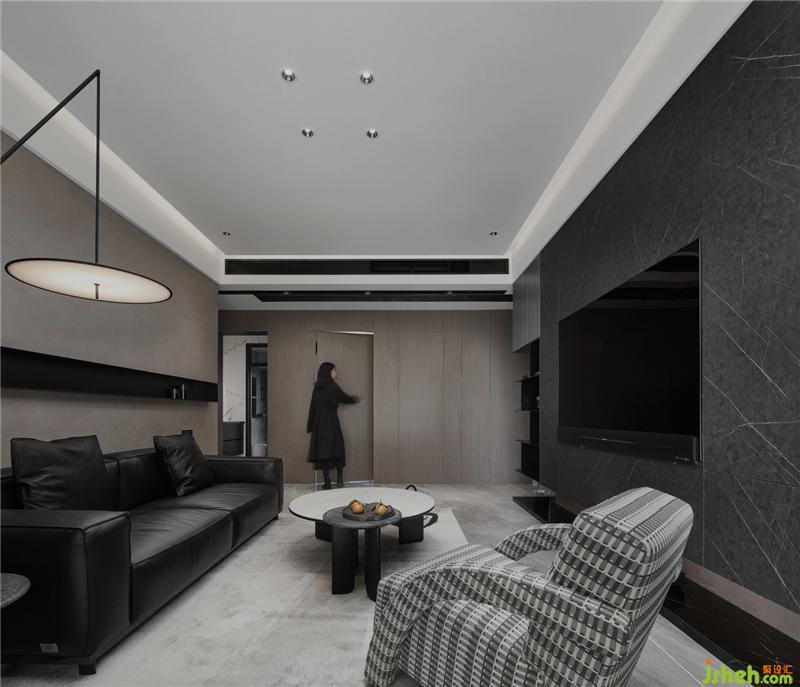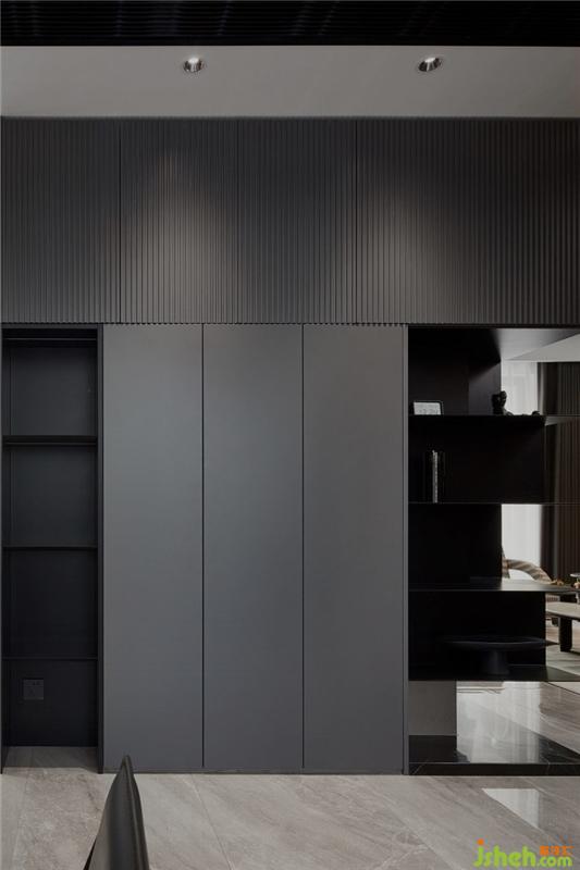 灰色玄關(guān)鞋柜在燈光的照射下顯得層次感十足,延伸至客廳,簡(jiǎn)練且時(shí)尚。